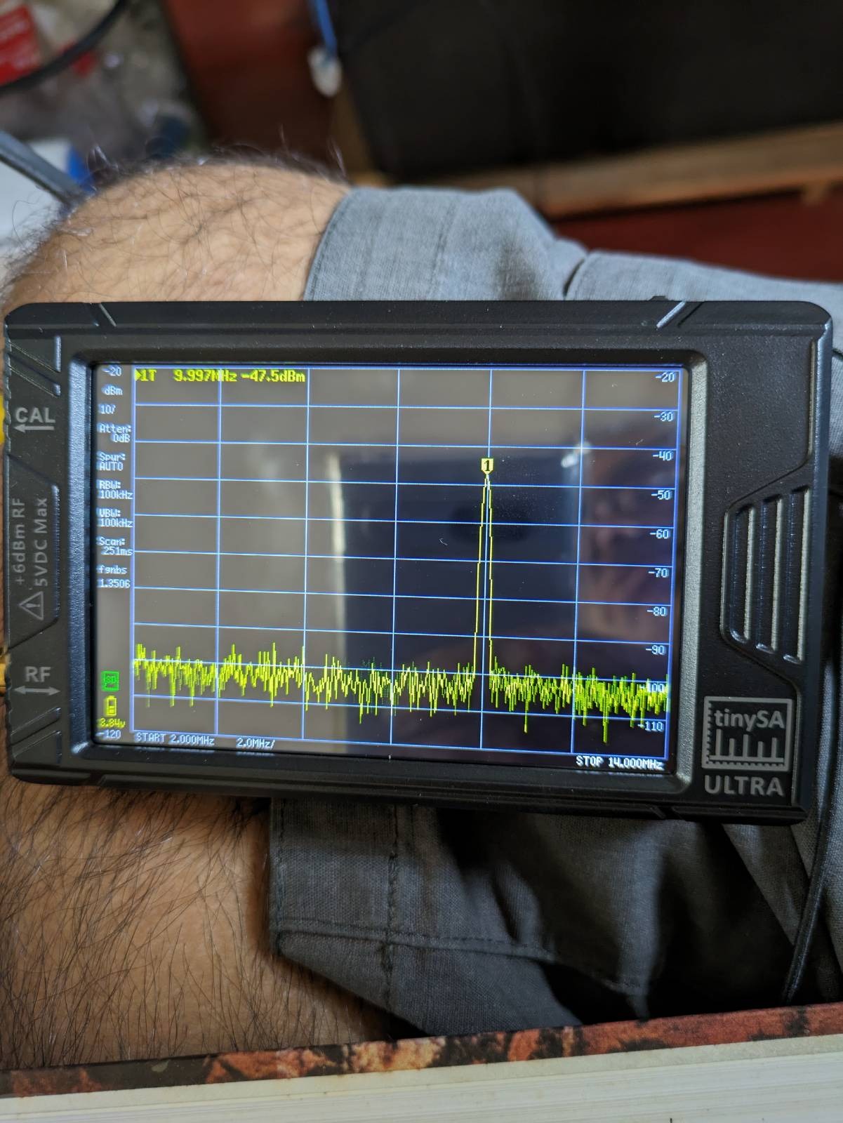 Output port is connected to a dummy load. Sampler output goes into TinySA.