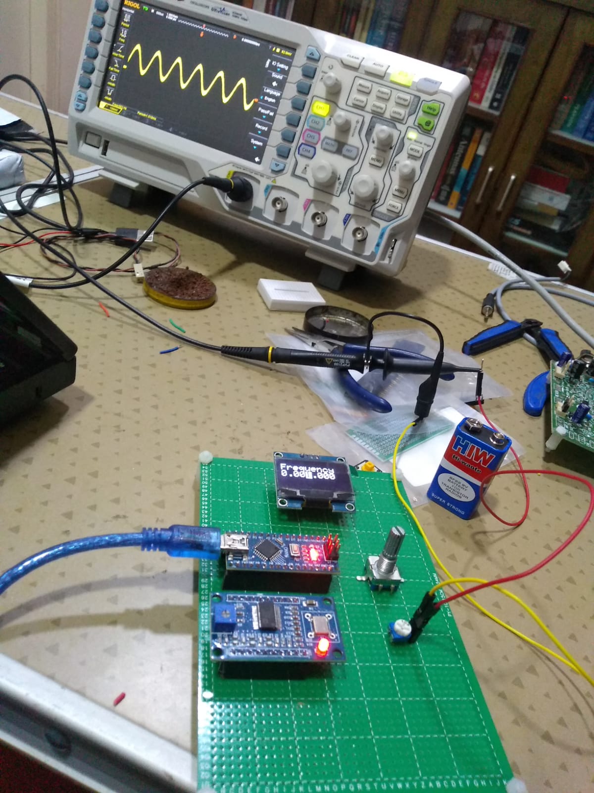 I built a signal generator based on ebay AD9850 card and a junk box encoder and an OLED 128x64 display. The code is mostly from Dean, KK4DAS signal generator. Some changes were done for display change etc. But the pins etc are more or less the same.