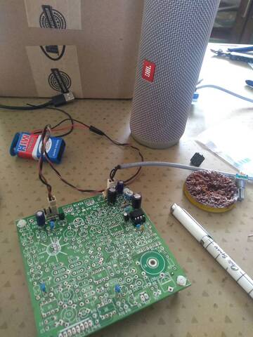 To test it, I wired up a audio socket that can plug into J4 and then hooked up a JBL speaker into it, powered it up with a 9V battery and moved the R8 to one side (anti-clockwise), not fully, but somewhere 1/4 from the end. After that, touching the R7 or C22 gives me a hum..